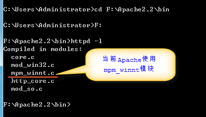 此外,如果我们想要知道某个Apache内部使用的是何种MPM模块,我们可以以命令行的方式进入Apache安装目录\bin,然后键入命令httpd -l,即可查看到当前Apache内部使用的何种MPM模块。