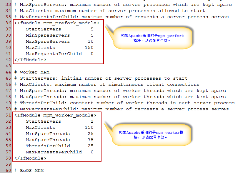 接着,我们再来看看mpm_perfork模块和mpm_worker模块下的默认配置: